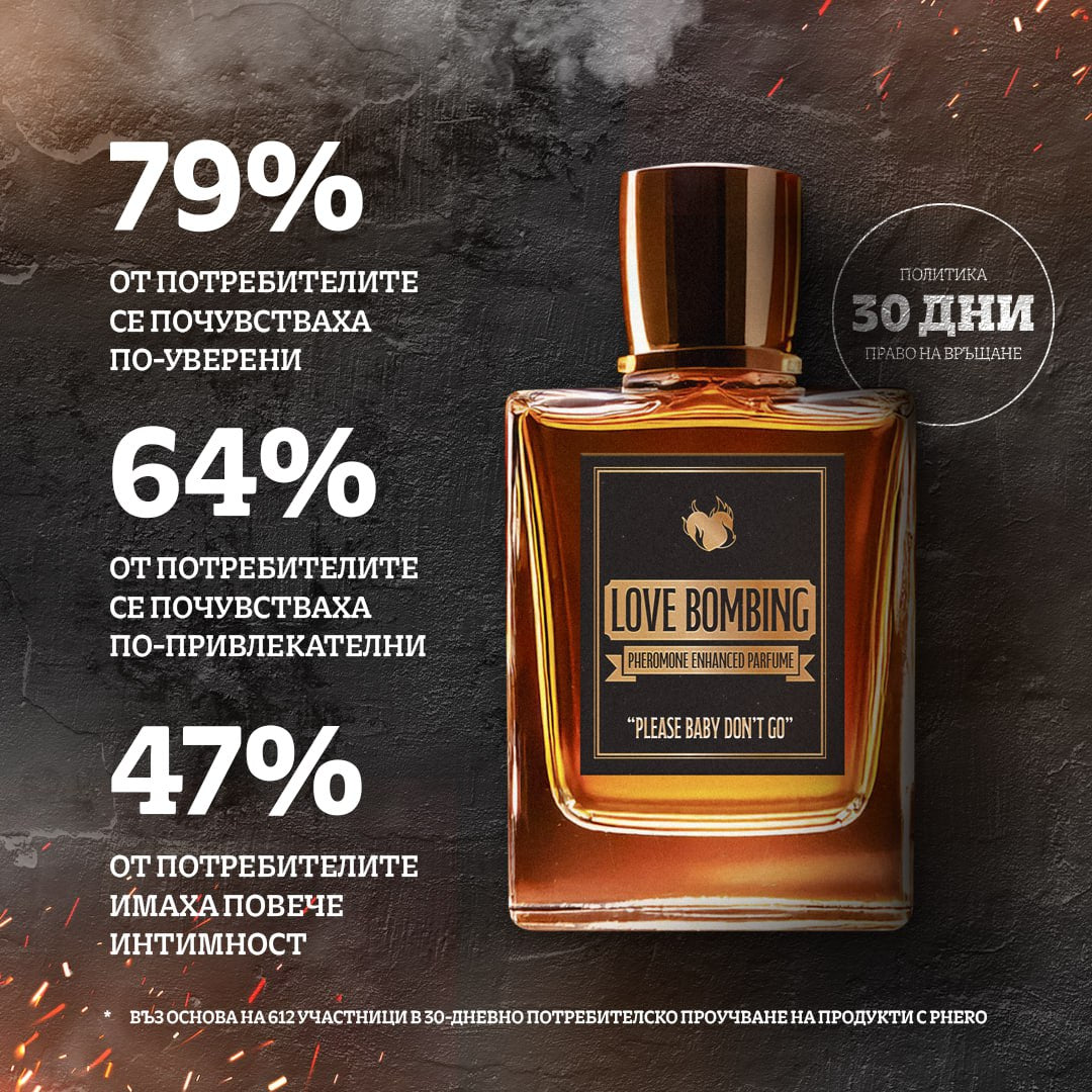 Твоите нива на феромони могат да ти попречат да направиш трайно впечатление. Формулата на Love Bombing, разработена от учени с повече от 20 години опит, използва мощна, подкрепена от науката смес за локално подобряване на твоите естествени феромони. Само няколко впръсквания и ще се почувстваш по-привлекателен и ще имаш повече увереност, за да съблазниш околните.